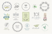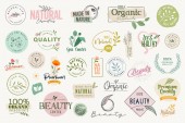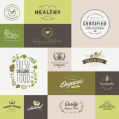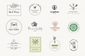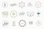 Zestaw etykiet i odznak do jedzenia i picia. Ilustracje wektorowe do projektowania graficznego i webowego, materiały marketingowe, menu restauracji, prezentacja produktów naturalnych, projekt opakowań.