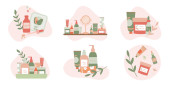 Maska, lustro, środek czyszczący, krem, mgła do twarzy, krem nawilżający, balsam płaski wektor ilustracja.