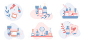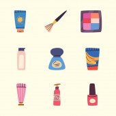 Zestaw produktów kosmetycznych i narzędzi płaski wektor ilustracji. Zielona piękność. Lustro, serum, olej, krem do twarzy, krem do rąk, środek czyszczący, maseczka do twarzy, przepaski na oczy, mgła do twarzy. Produkty do pielęgnacji własnej.