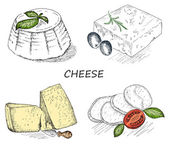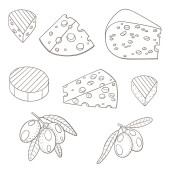 Wektorowa ilustracja graficzna z serem i oliwkami na białym tle
