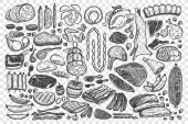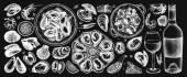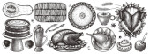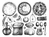 Kolekcja szkiców francuskiego jedzenia i napojów. Ręcznie rysowane potrawy na menu restauracji, przepis, projekt pikniku. Zestaw produktów spożywczych, przekąsek i napojów w grawerowanym stylu.
