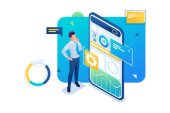 Człowiek pracuje nad aplikacją mobilną do gromadzenia danych. Płaska postać 2D. Koncepcja projektowania stron internetowych