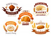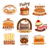 Piekarz, ciasto i chleb odizolowane ikony projektu wektora piekarni. Chleb, rogalik i bagietka, ciasto, babeczka, pączek i muffinka, placek, bułki zbożowe i sernik, tok, kapelusz szefa kuchni i emblematy wałków