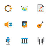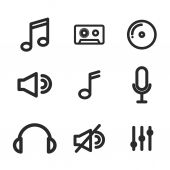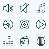 Muzyka i multimedialny ikona zestaw zarys zawierać koło, muzyka, początek, odtwarzanie, sygnał, faza, łączenie, dźwięk, dźwięk, rytm, mówić, mikrofon, dźwięk, dźwięk, głośność, wolumen, widmo, fala