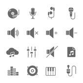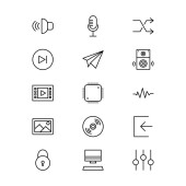 Muzyka i multimedialny ikona zestaw zarys zawierać koło, muzyka, początek, odtwarzanie, sygnał, faza, łączenie, dźwięk, dźwięk, rytm, mówić, mikrofon, dźwięk, dźwięk, głośność, wolumen, widmo, fala