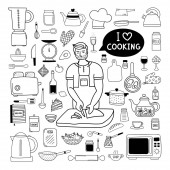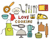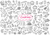 Zestaw ikon do gotowania bazgrołów. Doodle naczynia kuchenne kolekcja ikon. Ręcznie rysowane naczynia do gotowania. Doodle naczynia do gotowania kolekcja ikon