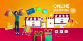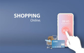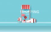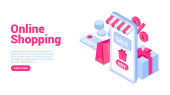 Paper Bag Koszyk pudełko na tle rynku. Wesołych Walentynek i Wesołych Świąt. Smartphone zakupy online na wakacje. izometryczny sklep telefonii komórkowej. Czerwony i biały dźwięk wektor koloru