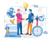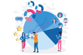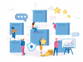 kreskówki kobieta w formalnym stroju z laptopem i małych pracowników