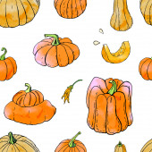 Płynny wzór dyń na białym tle. Ilustracja wektora narysowanego ręcznie.