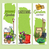 Szablon plakatu z narzędziami ogrodniczymi i kwiatami. Gumowe buty, puszka ogrodnictwa i kuter. Nawóz, rękawica, krokus, insektycyd, taczka i wąż nawadniający. ilustracja wektora w stylu szkicowym