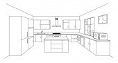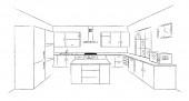Zdjęcie "Kuchnia wnętrza szkice ręcznie rysunek widok z przodu. Kontur wektor ilustracja meble kuchenne i sprzęt. Szafka, półki, naczynia, stół, lampa, zegar, dźwig, zmywarka, lodówka, mikrofalówka." może być wykorzystywane do celów osobistych i komercyjnych zgodnie z warunkami zakupionej licencji Royalty-free. Obraz jest dostępny do pobrania w jakości wysokiej rozdzielczości do 5760x3840.