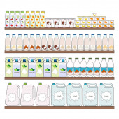 Zestaw opakowań zbóż, ziaren, orzechów na półce do przechowywania w kuchni. Ręcznie rysowany wektor ilustracji. Izolacja na białym tle.