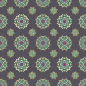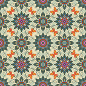 Dobra kartka z życzeniami. Zimowa sztuka wektorowa z arabeski, bazgroły i słodkie zielone i niebieskie płatki śniegu. Bezbarwny wzór bezszwowy.