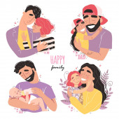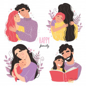 Pojęcie rodziny i dzieciństwa. Rodzice przytulają dziecko. Dziewczyna z najlepszymi przyjaciółmi. Starszy mężczyzna zabawia się ze swoją wnuczką. ilustracja wektora