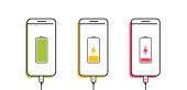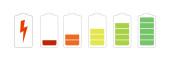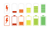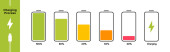 Ustaw akumulator o różnym poziomie naładowania. Wskaźnik akumulatora, znaki ładowania akumulatora. Bezprzewodowy sygnał energetyczny. Projekt graficzny wektora