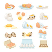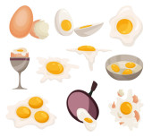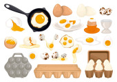 Jaja kreskówki izolowane na białym tle. Zestaw smażonych, gotowanych, popękanych skorup jaj, pokrojonych w plasterki jaj i jaj kurzych na patelni. Ilustracja wektora. Jaja zbierane w różnych postaciach