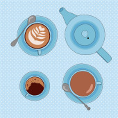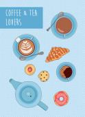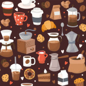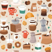 Płynny wzór wektora z filiżanek herbaty i kawy, ciasteczka i ciasta