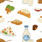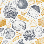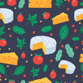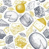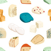 Produkty mleczarskie o różnej zawartości, bezszwowy wzór sera ekologicznego pokrojonego w kawałki. Asortyment delikatesów w sklepie lub na rynku. Cheddar i mozzarella, wektor porcji parmezanu w płaskim stylu