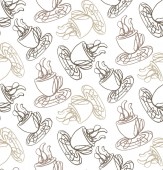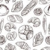 Grillowane pierścienie mięsa rybiego, smażone krewetki bezszwowy wzór. Dania z owoców morza w menu restauracji, gotowanie i przygotowywanie przekąsek. Przepis kulinarny. Monochromatyczny szkic, wektor w płaskim stylu