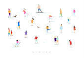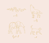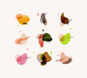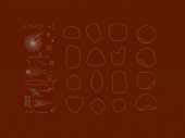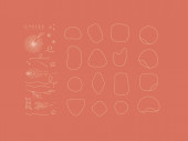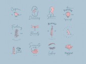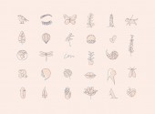 Ręce, etykiety, butelki kosmetyczne, symbole dekoracyjne, gałęzie, kwiaty, zwierzęta i różne przedmioty w minimalistycznym stylu graficznym rysunek na beżowym tle.