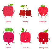 Cute wektor kwadratowy kształt uśmiechniętych owoców, warzywa o szczęśliwej twarzy w kolorze czerwonym - truskawka pomidor marakuja jabłko róża jabłko smok owoce. Kolorowy zestaw ilustracji na białym tle