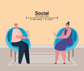 Odległość społeczna między kobietą i mężczyzną na stołach z projektowaniem wektorów kubków kawy