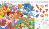 Znajdź 8 obiektów na zdjęciu. Puzzle ukryte przedmioty. Młodzi ludzie robią sobie selfie na dyskotece. Zabawna postać z kreskówki