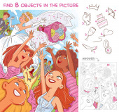 Zdjęcie "Znajdź 8 obiektów na zdjęciu. Puzzle ukryte przedmioty. Młodzi ludzie robią sobie selfie na dyskotece. Zabawna postać z kreskówki" może być wykorzystywane do celów osobistych i komercyjnych zgodnie z warunkami zakupionej licencji Royalty-free. Obraz jest dostępny do pobrania w jakości wysokiej rozdzielczości do 5760x3840.