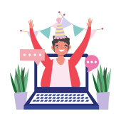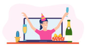 impreza online, urodziny lub spotkanie znajomych, człowiek w laptopie wideo z kapeluszem kielich wina i proporzec