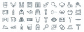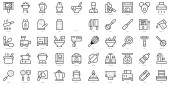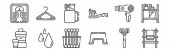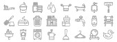 ikony linii łazienki. zestaw liniowy. wysokiej jakości zestaw linii wektorowych, takich jak waciki, kranówka, waga, stołek, kosz, ręcznik, wiadro, prysznic, zasłony prysznicowe
