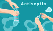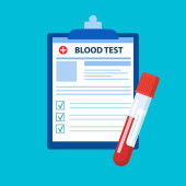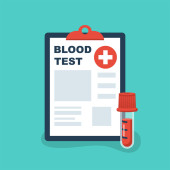 Rękawica lateksowa na szarym tle. Tabletka medyczna badanie krwi na baner społeczny, element sieci, promocja opieki zdrowotnej, plakat medyczny. Logo sklepu chemicznego lub karta informacyjna. Płaski styl ilustracja wektor akcji