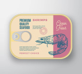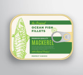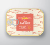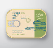 Abstrakcyjne filety rybne Vector River Filety aluminiowe z pokrywą etykiety. Projekt opakowań w puszkach Premium. Typografia retro i ręcznie rysowana sylwetka szczupaka Układ tła.