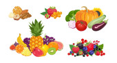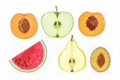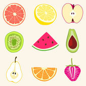 Kawałki owoców wyizolowane na białym. Ilustracja wektora pomarańczy, kiwi, mangosteen, figa, banan i truskawka w kreskówkowym stylu płaskim.