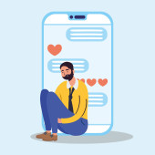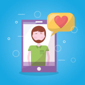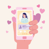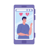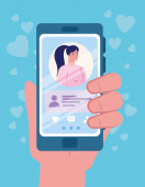 aplikacja online dating service, hand holding smartphone with man profile, nowoczesny człowiek szuka pary, social media, wirtualny związek koncepcja komunikacji