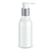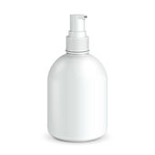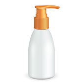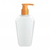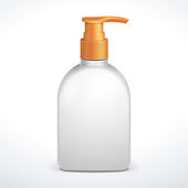 plastikowe czysty biały butelka z pompką żółty dozownik. żel pod prysznic, mydło w płynie, balsam, krem, szampon, płyn do kąpieli. gotowy projekt. ilustracja na białym tle. eps10 wektor