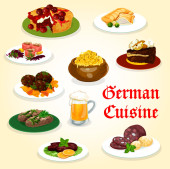 Szwajcarska kuchnia wektor piernika leckerli, kaczka z pomarańczą, chleb i ciasto marchewkowe. Szwajcarska zupa z jęczmienia perłowego i sera, potrawy z filetów okoniowych menu restauracji mięso i desery okrągła rama, plakat