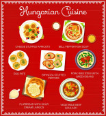 Węgierska kuchnia wektorowe kiełbaski z sosem chili i cebulą, sałatka z jajkiem, tradycyjny gulasz warzywny, duszona kapusta z pieprzem, zimna zupa wiśniowa, słodkie ciasteczka. Węgierskie potrawy spożywcze zestaw banerów