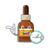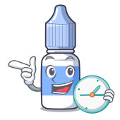 Obraz wesołej medycznej butelki testowej trzymającej zegar