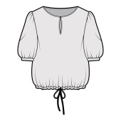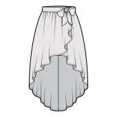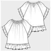 Ilustracja moda techniczna z falbankami i rękawami, zapięcie z przodu.