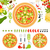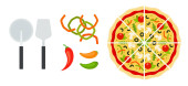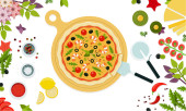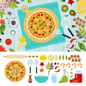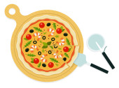 Świeża pizza włoska z pomidorami, serem, oliwkami, grzybami, bazylią na drewnianej desce z narzędziami do gotowania.