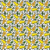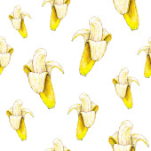 Ręcznie rysowany szkic stylu obrane banan bezszwowy wzór na tle żółtych pasków. Wektorowe tło dla tekstyliów, nadruków, opakowań.