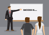 Kreskówkowy biznesmen na szczycie sukcesu odpycha innych. Kreatywna ilustracja wektora metafory bezlitosnych i samolubnych czynów, aby utrzymać się na szczycie sukcesu biznesowego.