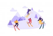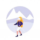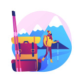 Wyprawa górska. Wędrowanie i poczucie przygody. Backpacker na wakacjach, spacery turystyczne, wspinaczka podróżnych. Wędrówki po alpejskim szczycie. Ilustracja pojedynczej koncepcji wektora.