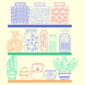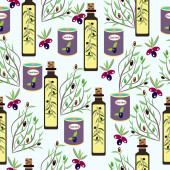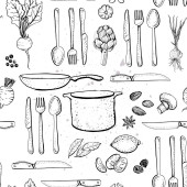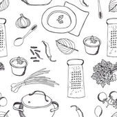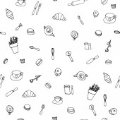 Płynny wzór bazgrołów elementów żywności na białym tle. Tło ze śniadaniem zdrowe śniadanie Płatki zbożowe granola, herbata, czajnik i świeże smoothie.