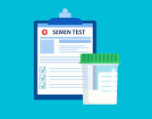 Test nasienia na białym tle. Tabletki medyczne i słoiki na baner społecznościowy, element strony internetowej, promocja opieki zdrowotnej, plakat medyczny. Logo sklepu chemicznego lub karta informacyjna. Płaski styl ilustracja wektor akcji
