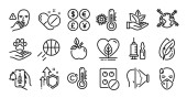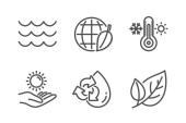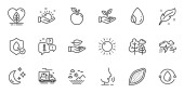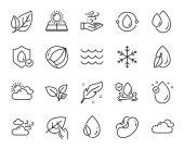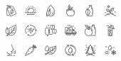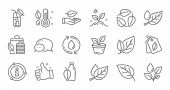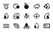 Zestaw ikon przyrodniczych, takich jak Bio shopping, Leaf. Dyplom, pomysły, uratować planetę. Deszczowa pogoda, energia wiatru, fale. Jabłko, Woda, Pogoda na świecie. Liście, orzechy pistacjowe, ekologiczne ikony linii. Wektor