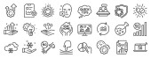 Zestaw ikon technologicznych, takich jak eksperyment chemiczny, Przesuń w górę. Dyplom, pomysły, uratować planetę. Zarządzanie czasem, Przechowywanie w chmurze, Schemat. Przewiń w dół, czekaj, poprawna odpowiedź. Wektor