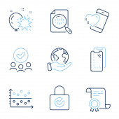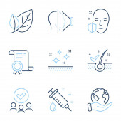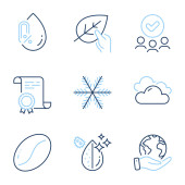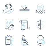 Kropla wody, ochrona Uv i myć ręce zestaw ikon linii. Dyplom, zapisać planetę, grupę ludzi. Pielęgnacja skóry, 24 godziny i znaki ochronne. Olej z surowicy, krem do skóry, krem do twarzy. Wektor
