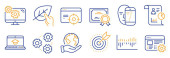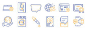 Zestaw ikon technologicznych, takich jak Wifi, Dokumentacja online. Certyfikat, uratować planetę. Recykling, tworzenie muzyki, pogawędka przyjaciół. Timer, kasa, Bitcoin pay. Żarówka, ikony linii Puzzle. Wektor