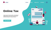 Kalendarz z wypłatą, kalkulatorem i drobnymi biznesmenami dostającymi wypłatę. Gotówka na wypłatę, depozyt podatkowy, koncepcja oprogramowania do listy płac. Strona internetowa żywe fioletowe lądowania szablon strony internetowej.